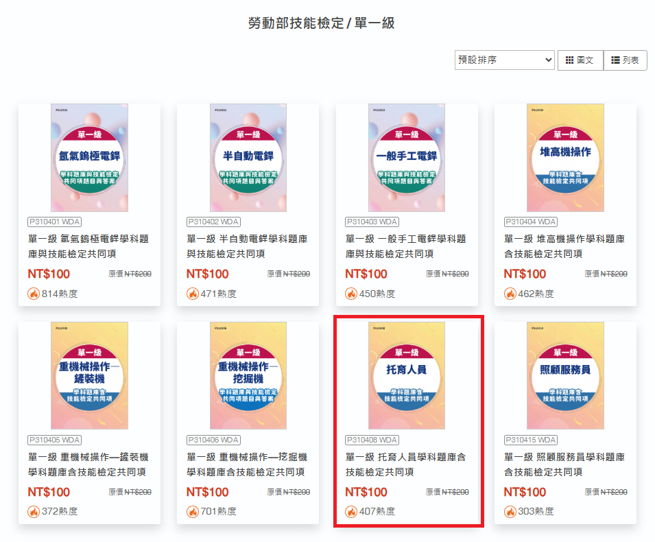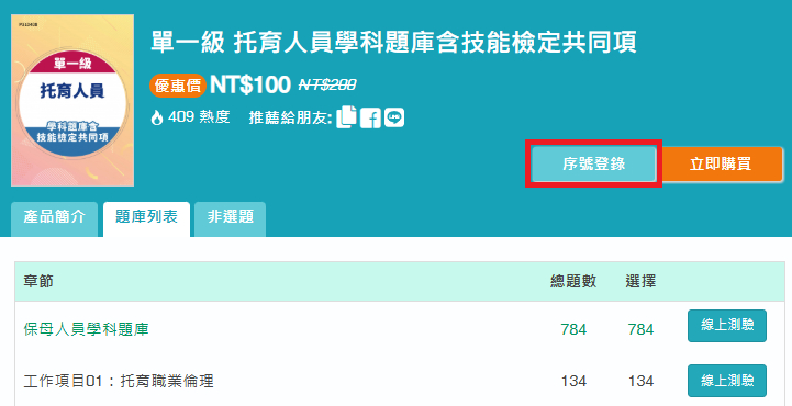 透過產品編號或關鍵字搜尋購買的團購商品,例如: P310408《單一級 托育人員學科題庫含技能檢定共同項》。