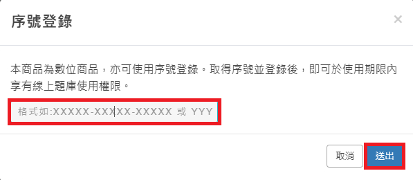 依提示將20碼序號填入,每隔5碼用「-」分隔。可直接複製貼上整組序號以加快操作。